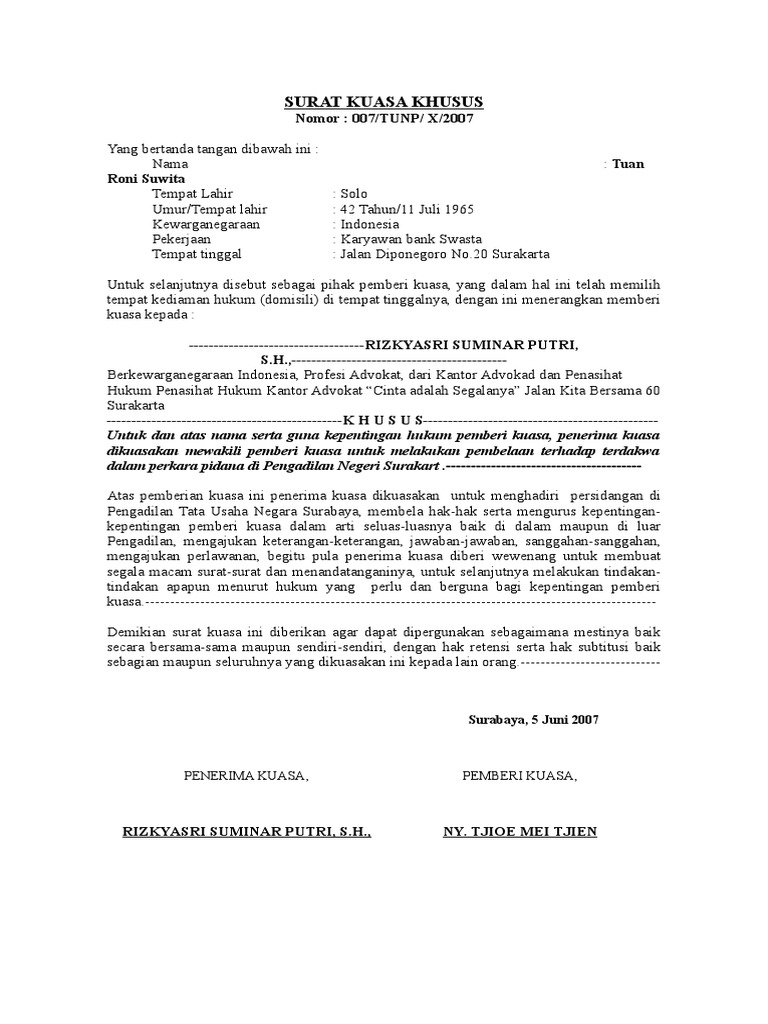 Contoh surat tuntutan dalam tindak pidana kesusilaan. Keberadaan surat kuasa sebenarnya telah diatur. Lioe lely darmayanti, beralamat di jl. Surat kuasa khusus meliputi kegiatan tertentu yang dialihkan ke penerima kuasa. Dalam surat kuasa khusus dikenal istilah pemberi kuasa yaitu orang yang menguasakan dan penerima.
