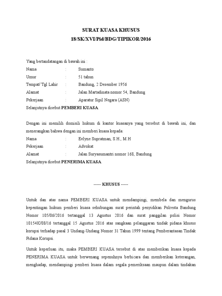 Contoh Surat Kuasa Khusus Tindak Pidana Korupsi / Surat Kuasa Khusus - Lioe lely darmayanti, beralamat di jl.. Yang bertandatangan dibawah ini : Dan untuk surat kuasa khusus pidana sendiri adalah surat khusus untuk menindaklanjuti kasus tindak pidana dalam mendampingi pelaku pada penyidik kepolisian, kejaksaan hingga pada persidangan perkara tersebut di pengadilan. Temukan informasinya dalam ulasan berikut ini. Akan tetapi sebelum masuk pada inti pembahasan yaitu contoh surat kuasa, alangkah baiknya jika kalian ketahui terlebih dahulu mengenai tentang. Untuk mendapatkan file contoh surat kuasa khusus advokat yang tidak diproteksi dan bebas untuk diedit, silahkan anda kunjungi situs kami.