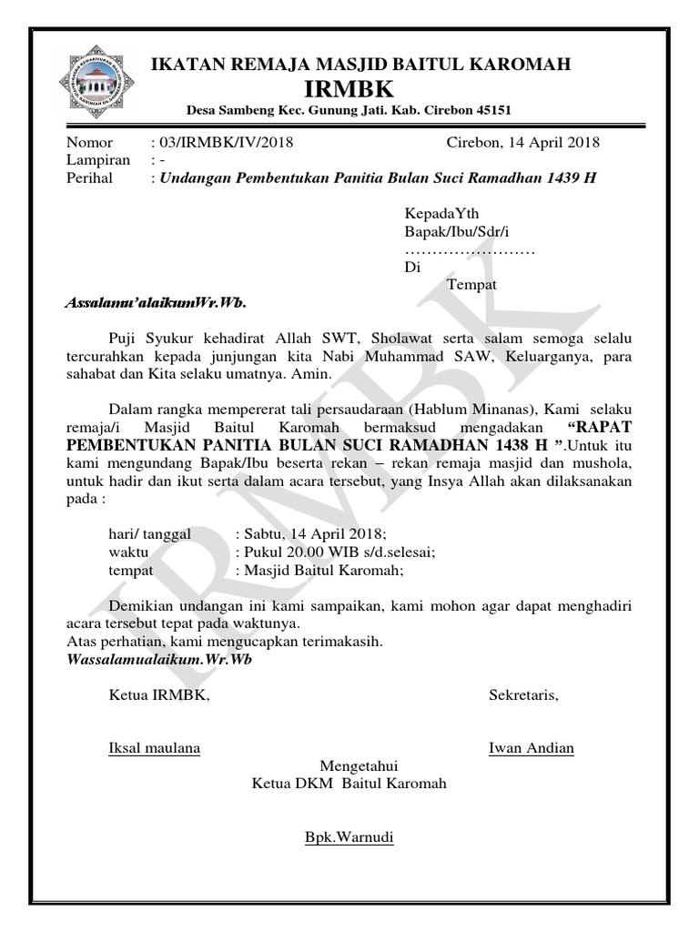 Rapat koordinasi pembangunan masjid baitul muttaqin. Contoh surat undangan rapat pertemuan 2019 kumpulan contoh surat undangan rapat pengurus masjid contoh surat undangan rapat pertemuan kali ini kami akan sampekan kepada anda sekalian yang ingin buat surat undangan rapat tetapi kurang tahu cara buatnya maka kami akan sampekan disini untuk membuat surat undangan buat para calon rapat nantinya di. Sedangkan contoh undangan irma (ikatan remaja masjid) dalam versi singkat padat dan praktis sebagai berikut; Surat undangan rapat pemilihan dewan kemakmuran masjid (dkm) panitia pemilihan dewan kemakmuran masjid (dkm) masjid jami nur iman kp. Bumdes contoh surat undangan rapat pembentukan karang taruna contoh surat undangan rapat pemilihan ketua rt contoh surat undangan rapat pengurus yayasan contoh surat undangan rapat.
