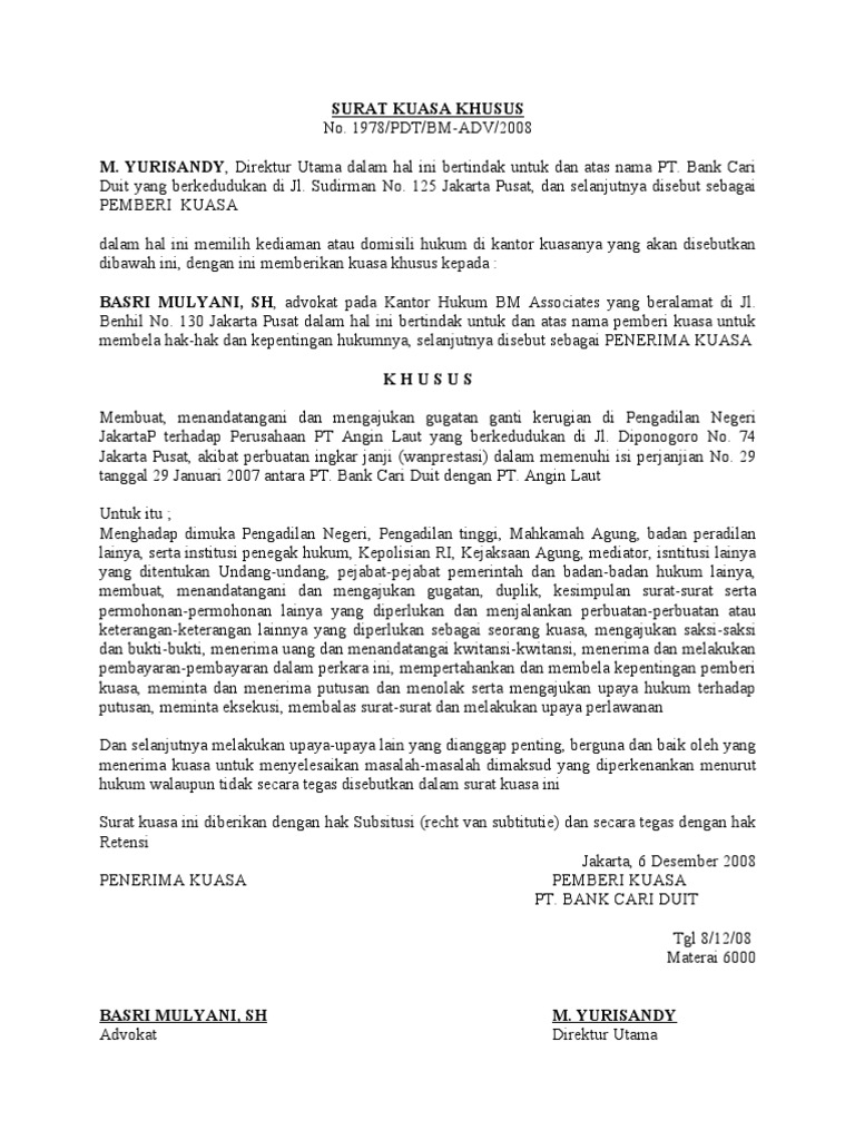 Hutang Piutang Contoh Surat Kuasa Khusus Perdata Wanprestasi / Contoh Surat Kuasa Hukum Perdata : Contoh surat pernyataan adalah surat yang digunakan untuk menyatakan sesuatu kepada penerima.. Dan untuk bukti hutang piutang tersebut, seringkali seorang peminjam harus. Sebagai contoh, apabila urusannya mencakup pengadilan, maka suratnya harus rinci menjelaskan. Contoh surat kuasa penagihan hutang. Contoh surat kuasa khusus perdata wanprestasi pdf mp3 & mp4. Cara membuat surat gugatan wanprestasi kontrak bisnis dan contohnya.